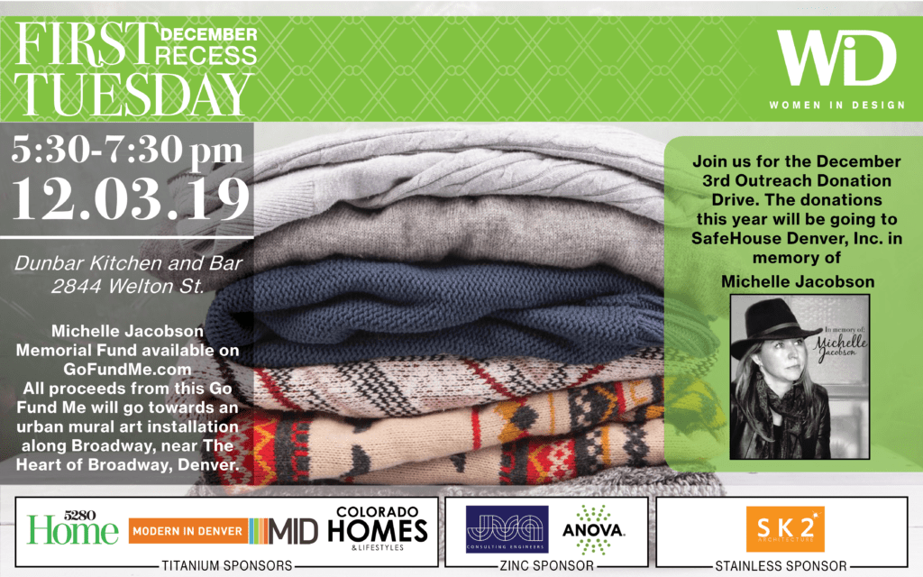 Join WiD for our annual philanthropic December First Tuesday. This year the Outreach committee will be collecting in-kind donations to SafeHouse Denver in honor of Michelle Jacobson. The list (only new items, please) can be found on their website https://safehouse-denver.org/get-involved/wish-list.html.