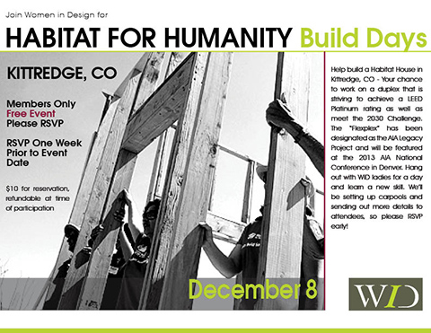 Help build a Blue Spruce Habitat for Humanity House in Kittredge, CO-Your chance to work on a duplex that is striving to achieve a LEED Platinum rating as well as meet the 2030 Challenge. The "Flexplex" has been designated as the AIA Legacy Project and will be featured at the 2013 AIA National Conference in Denver. Hang out with WiD for a day and learn a new skill!! We'll be setting up carpools and sending out more details to attendees so please RSVP early!